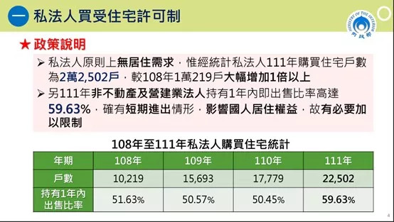 私法人原則上並無居住需求,若未加以限制,住宅極易成為資金停泊與炒作標的,導致市場投機、囤房與價格失真,進而侵蝕一般民眾的居住權益 ,如內政部統計的資料所示,自從房地合一稅上路後,有部分投資客會利用成立投資公司的方式來進行房地產投資。