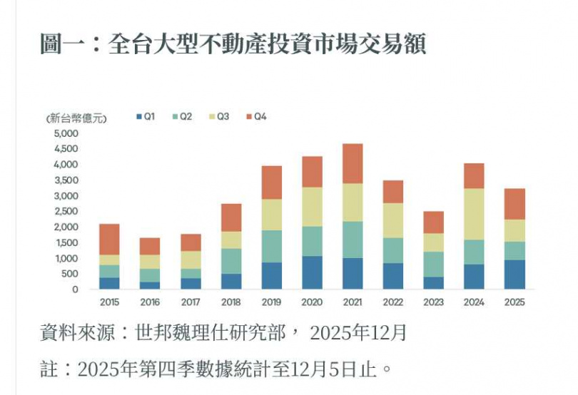 根據世邦魏理仕研究部統計,截至12月5日,2025年全台大型土地及商用不動產成交金額共計3,235億元,對比去年同期下滑15%。分析衰退原因,主要是土地買賣市場成交量較去年衰退35%至1,692億元,尤其在全台住宅市場交易大幅萎縮、銀行業承作土建融案態度趨嚴的影響下,今年本土建商購地意願明顯下滑,2025年迄今建商購地金額僅893億元,較去年同期大減53%。