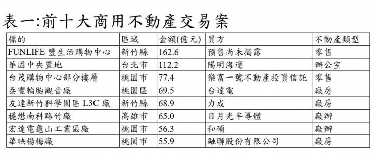 零售不動產則排名第三,交易總金額為272億,主要交易包括竹北豐生活購物中心的預售買賣案,以及樂富一號REITs購買台茂部分產權,分別貢獻162.6億及77.4億元。